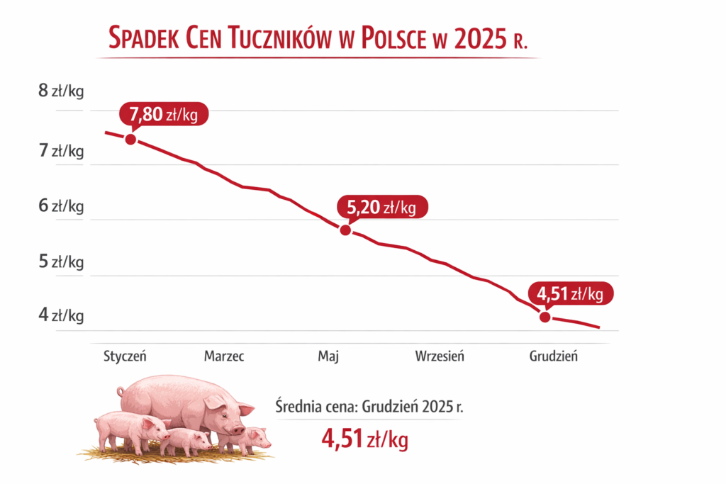 W ostatnich miesiącach rynek tuczników w Polsce przeżywa prawdziwe trzęsienie ziemi — ceny skupu żywych świń gwałtownie spadły do poziomów, które wielu hodowców określa jako „poniżej kosztów produkcji”. Według danych z grudnia 2025 r. stawki za żywe tuczniki w skupach wahały się średnio między 3,90 a 6,00 zł/kg żywej wagi, a średnia cena wyniosła ok. 4,51 zł/kg, czyli znacznie mniej niż rok wcześniej.